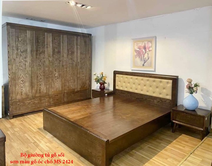 - Bộ phòng ngủ gỗ sồi sơn màu gỗ óc chó