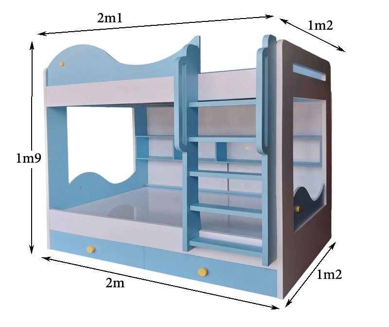 - Màu sắc: Giường có màu trắng phối xanh trẻ trung hoặc tùy chọn màu sắc theo yêu cầu của khách hàng.