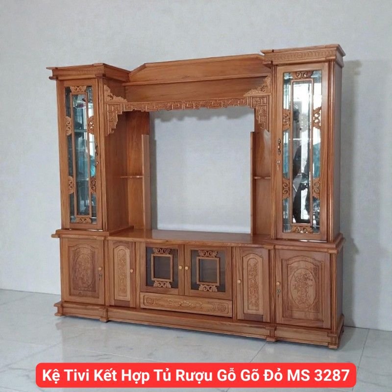 Mẫu kệ tivi kết hợp tủ rượu gỗ gõ đỏ được thiết kế thông minh, tích hợp nhiều công năng trong cùng một sản phẩm. Phần kệ tivi rộng rãi giúp bố trí tivi, đầu thu, loa một cách gọn gàng, trong khi hệ tủ rượu đi kèm tạo điểm nhấn sang trọng cho phòng khách.