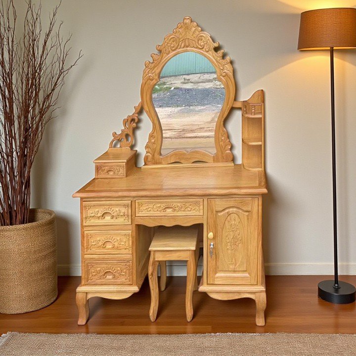 - Bàn trang điểm 1m1: Bàn trang điểm có gương lớn chạm khắc cầu kỳ, kết hợp nhiều ngăn kéo tiện lợi. Đây không chỉ là nơi làm đẹp mà còn là một món đồ nội thất đầy tính nghệ thuật.