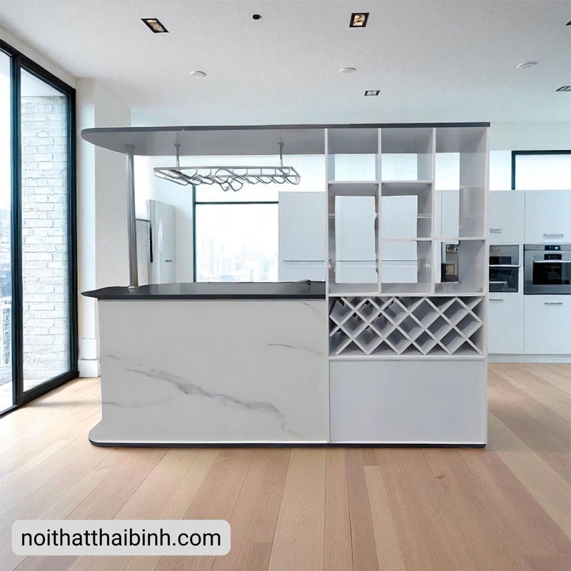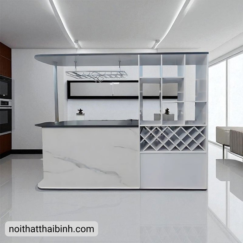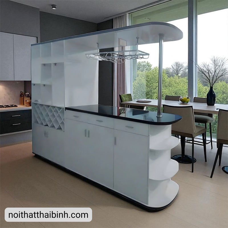 Điểm nổi bật đầu tiên của chiếc quầy bar đa năng sang trọng này chính là thiết kế thông minh, tối ưu hóa công năng sử dụng. Với cấu trúc hai tầng, quầy không chỉ đóng vai trò là nơi pha chế đồ uống mà còn là một vách ngăn tinh tế, phân chia khu vực bếp và phòng ăn một cách khéo léo.
