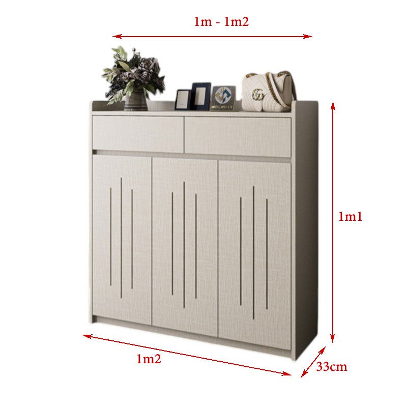 - Tủ Giày Kín Đáo: Với 3 cánh cửa đóng mở tiện lợi, tủ giúp cất giữ giày dép gọn gàng, ngăn nắp, tránh bụi bẩn và giữ cho không gian luôn sạch đẹp. Thiết kế đường kẻ dọc trên cánh cửa không chỉ tạo điểm nhấn độc đáo mà còn mang lại cảm giác thông thoáng.
